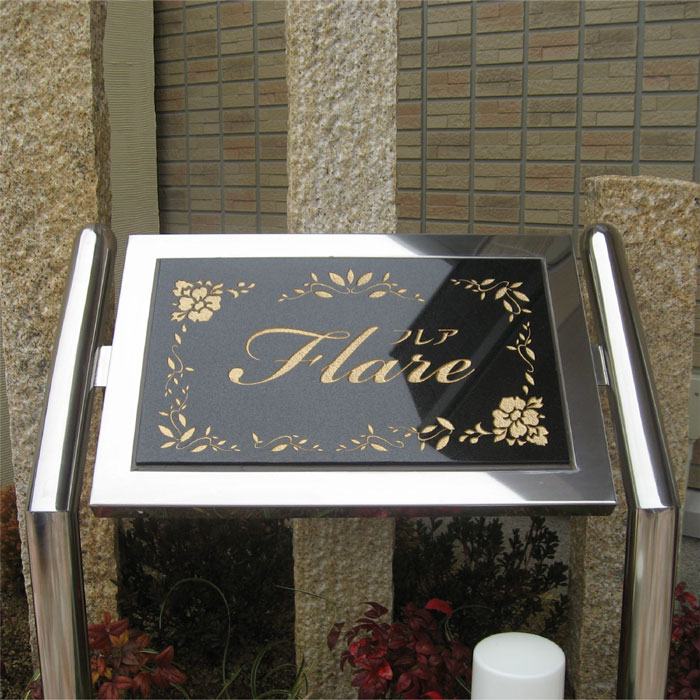 フレーム付き 黒御影石銘板 スタンダード 2本足ステンレス丸支柱(60φ鏡面)W500×H300×D25mmマンション名看板 アパート名看板 館銘板 集合住宅 館名板 オフィス表札 事務所 MBF15-04