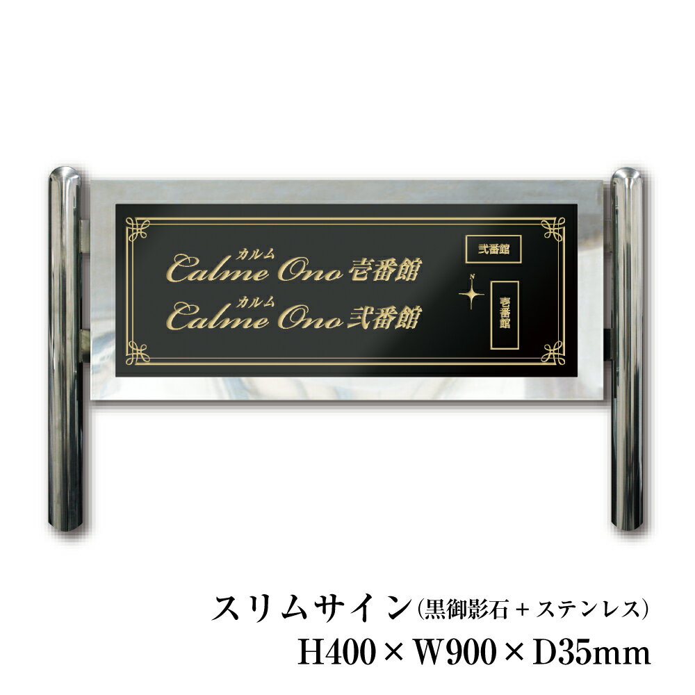 サイズ 名称面板:H300×W800×D25mm フレーム:H400×W900×D35mm(支柱サイズは下記仕様図面参照) 材 質 名称面板:黒御影石 フレーム・支柱:ステンレス鏡面仕上げ 加 工 御影石表面磨き 文字:サンドブラスト彫り込み 色入れ塗装(あり・なし選択可) 同 梱 内 容 施工方法・お手入れ方法説明書・取り付け用ボルト 【 ※ ご注意 】 細かいデザインは製作できない場合がございます。